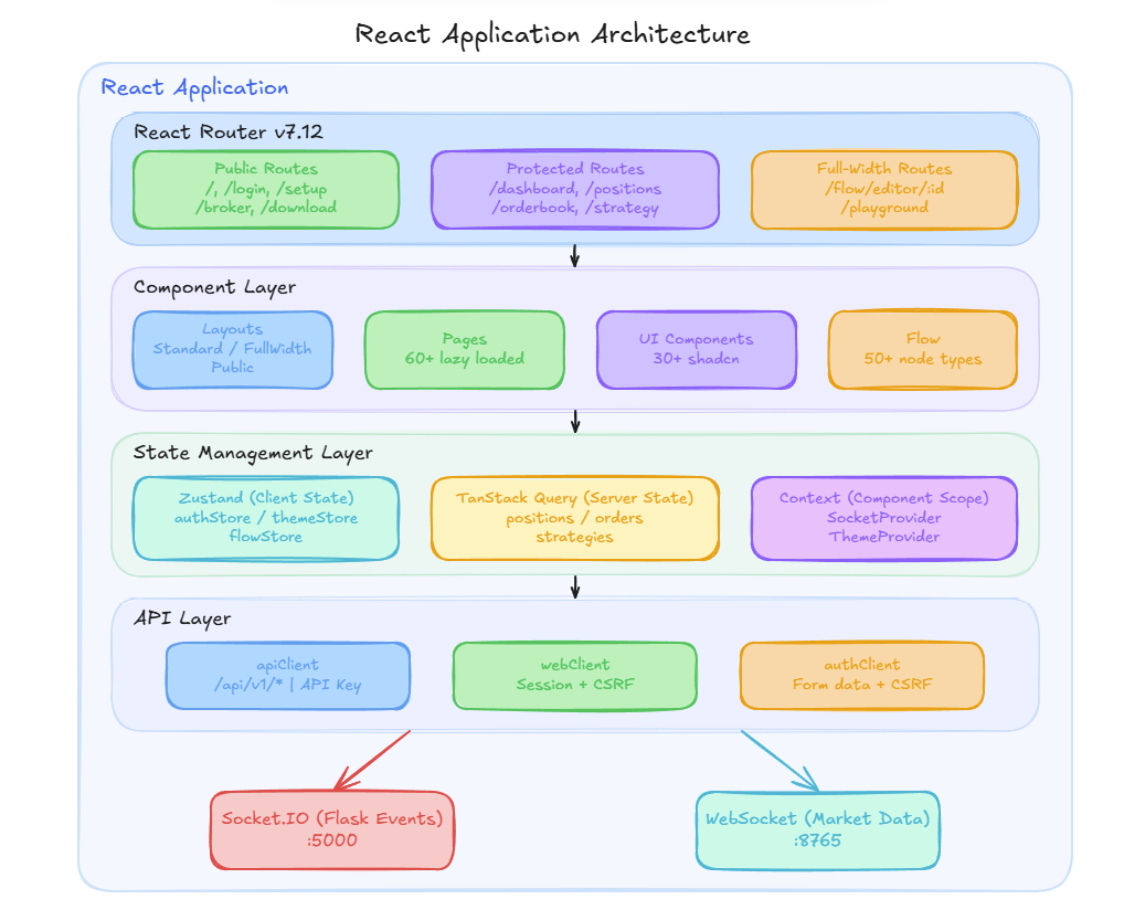 OpenAlgo features a modern React 19 Single Page Application (SPA) built with TypeScript, Vite, and Tailwind CSS 4. The frontend provides a responsive trading interface with real-time market data, visual workflow automation, and comprehensive strategy management.