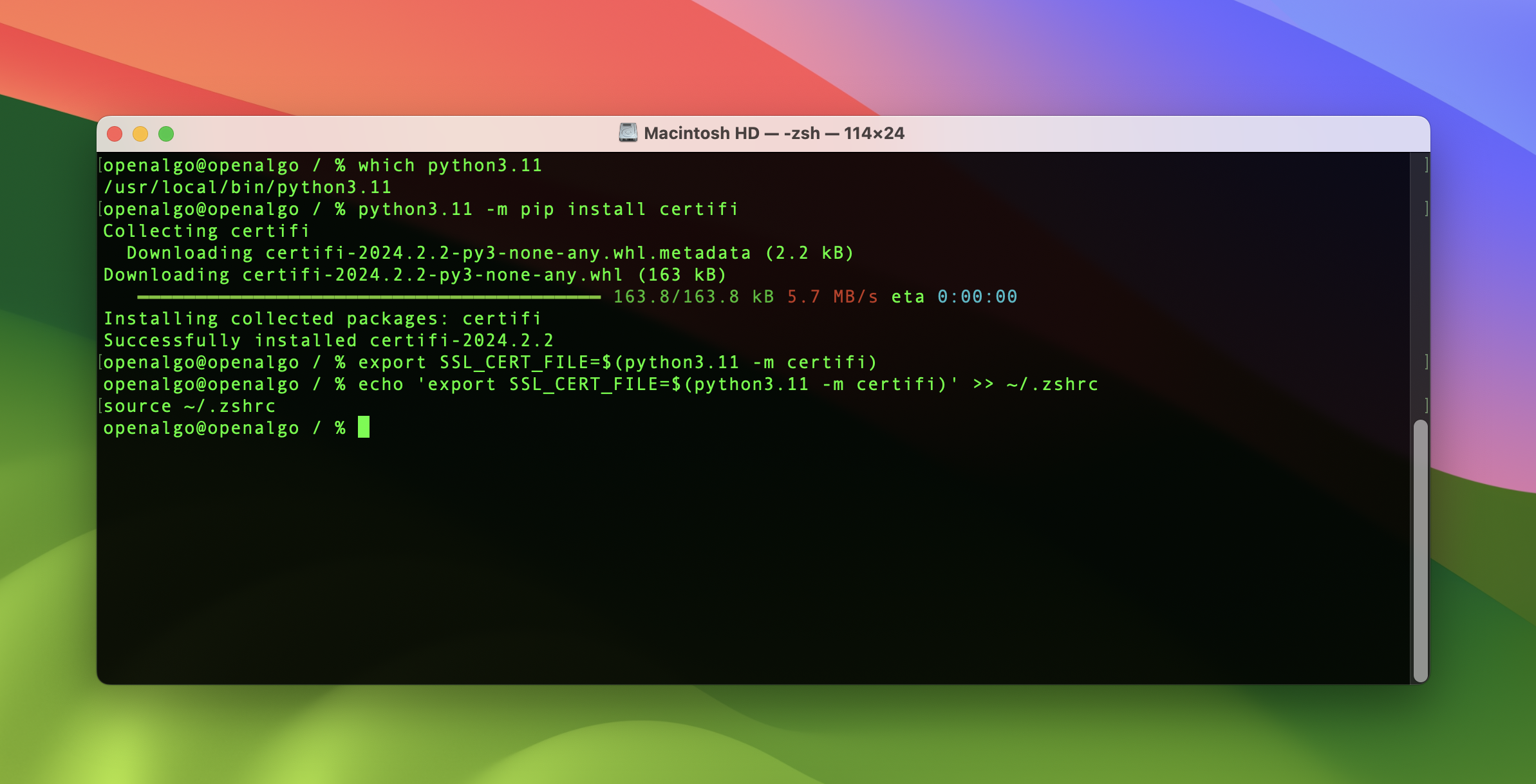 After setting up the certificates through certifi, try running your Python code again. This should resolve any SSL certificate issues.