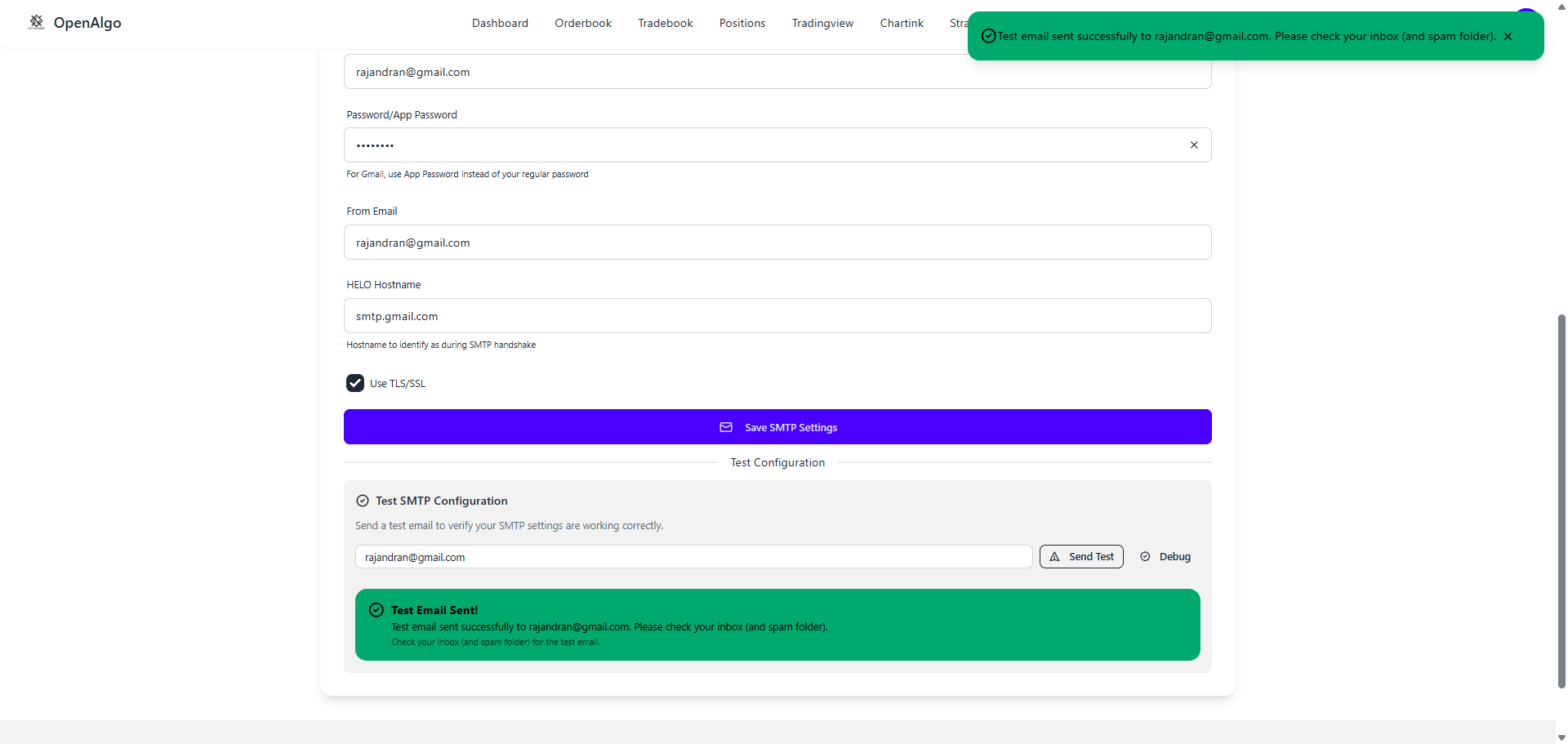 **That's it!** Your OpenAlgo can now send emails for password resets and notifications using your preferred email provider. Choose the configuration that best fits your organization's setup and security requirements.