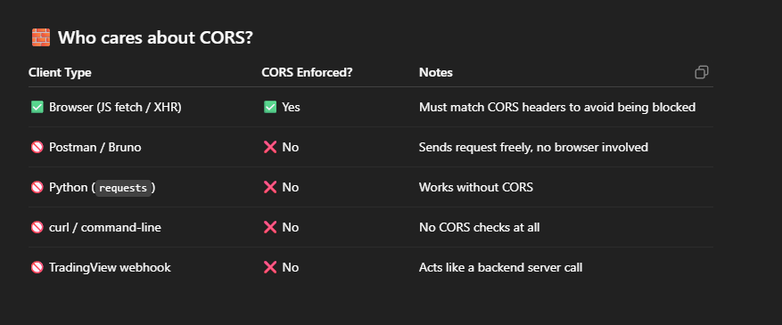 > 🧠 **CORS does not affect Postman, curl, TradingView, or server-side requests.** It's enforced only by browsers.